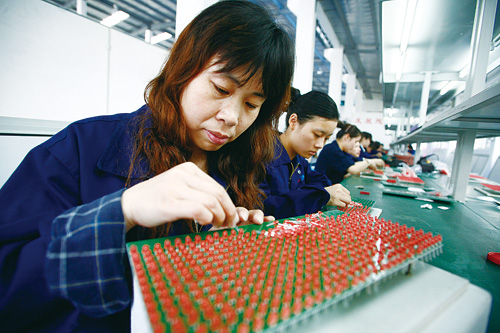为了解决残疾人就业难,大禹电气科技股份有限公司针对市场需求,投资近500万元,增开了一条电子显示屏生产线,使170多名残疾人走上了就业岗位。一年来,创产值600万元。图为5月26日,残疾就业工人正在电路板上装配发光二极管。
