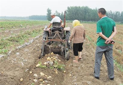 昨天下午,在大赵家庄村土豆收获机的生产车间里,记者见到了依然朴实的村民吴洪珠,他正在调试一台土豆收获机。“12年前,我驾驶收割机给人收小麦,看到村民们人工刨土豆,费力还不出活,所以我就想造出一台能收土豆的机器。”吴洪珠告诉记者,周边很多村庄都有种植土豆的传统。可由于土豆埋在地下,收起来非常麻烦,用镢头刨是最常用的办法,5个人收1亩土豆需要一天不间断劳作才能收完。产生这个想法后,他就买来各种机械书籍学习,经过3年多的潜心研究,终于发明出了土豆收获机。 目睹1亩地土豆20分钟搞定 吴洪珠将记者带到了他们村后的地里,让记者见证土豆收获机的“神奇”。记者看到,土豆收获机由铲头、传动带和两个轮子组成,在将土豆收获机挂靠在拖拉机上后,通过拖拉机的动力带动,深埋在土里的土豆很快就被翻到了地上。20分钟后,1亩地的土豆就全部收获完毕。“1个小时能收获3亩土豆,而且还不会对土豆造成损坏,有效提高了土豆收获能力。”吴洪珠说,看到土豆收获机的“威力”后,现在村里已经有6户村民购买了他的土豆收获机,而购买了机器的村民在收获完自家土豆后,也像麦收一样,开着机器去协助其他村民收获土豆,也成了农忙季节赚钱的一种新方式。