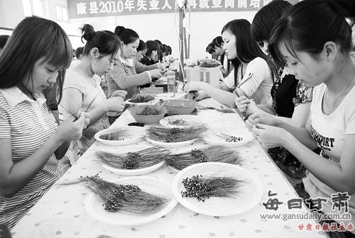 新华网甘肃频道消息 8月3日,在康县失业人员就业岗前培训班上,女青年神情专注地进行实际操作。近年来,康县通过技能培训、建立基地等多种途径,有效促进了城乡劳动力就业。