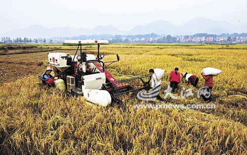 近日,在瑞昌市横港镇的稻田里,收割机正在收割一季晚稻。今年,瑞昌市加大了秋粮水稻种植力度,积极推广水稻工厂化育秧、机械化种植、专业合作社管理等措施,全市中、晚稻长势喜人,为全年粮食丰收奠定了扎实基础。本报记者燕平摄