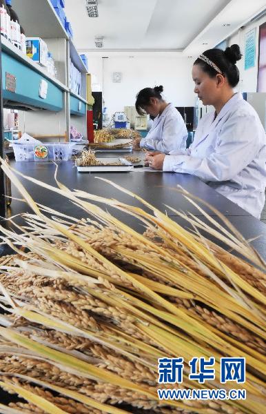 在黑龙江省八五六农场,科研人员在进行水稻田间试验后期“室内考种”(9月19日摄)。