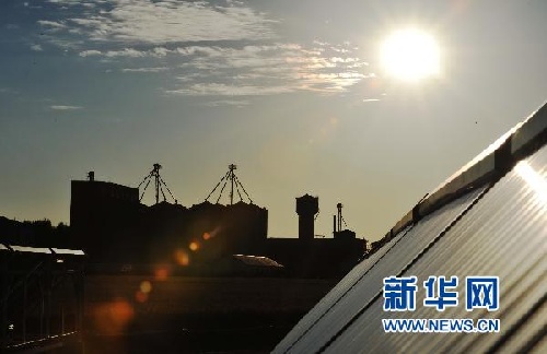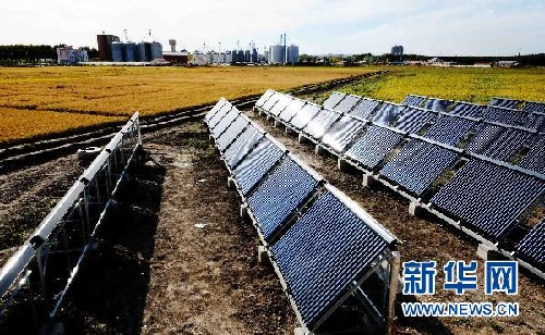 在黑龙江省八五六农场,采用太阳能加热系统的“田块水温控制系统”被设置在一块稻田旁,这个系统在稻田环境温度过低时,保持田间水温处在一定范围内(9月18日摄)。