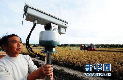 在黑龙江省八五六农场,一名工人在稻田旁维护“田间视频监控系统”,这个系统采用无线视频技术,可实时获取当前水稻生长环境信息,为综合实验提供基础数据(9月18日摄)。