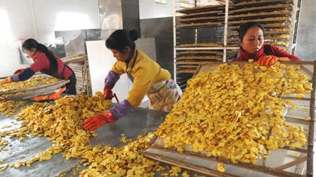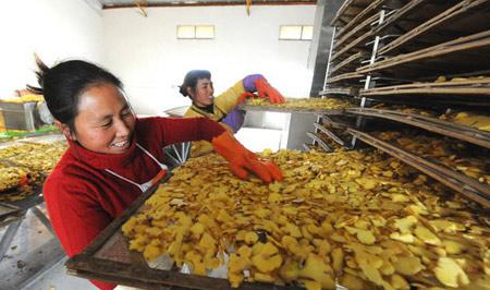 板桥黄姜开发协会生产车间的工人对黄姜进行干燥处理
