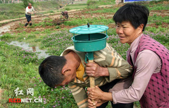 (峦山村农民夏解秋夫妇在稻田安放免费“诱捕器”捕杀虫害)