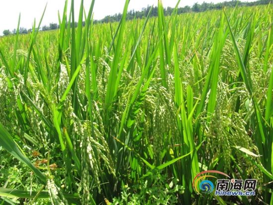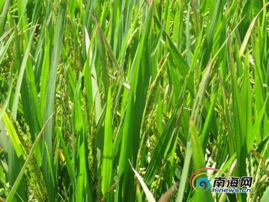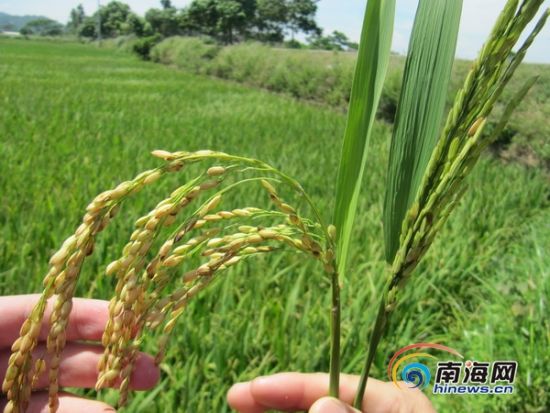 南海网记者根据万宁市万城镇北坡墟群众的反映,到了田间现场走访。站在田边一眼望去,尽是一片绿油油的景象,但是当记者走到田间却发现了两种长势的稻谷,一种稻谷的稻穗变成了金黄色,摸上去可以明显感觉出稻穗的饱满,这种饱满的稻穗已经歪向一侧;但另一种稻穗却仍然是绿色,直挺挺地竖着,随风摇摆,摸上去则感觉明显的空瘪,用力捏下去,其中部分的稻穗会流出白色的浆汁,剩下的稻穗则什么都没有。