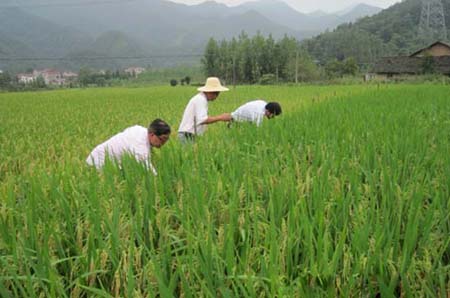 图为县农业技术中心技术人员到烟墩镇霭里村优质粮生产示范片田间调查丰产增收情况。