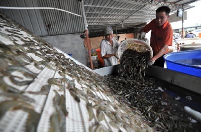 日前,慈溪南美白对虾进入捕捞旺季,庵东西一某水产收购点每天有近百养殖户前来投售,日投售白对虾十万多斤。