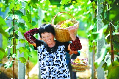 村民正在采摘高山有机葡萄。金寨县南溪乡王畈村坐落在大别山深处。2009年在返乡农民洪梅和朱峰的带领下,该村利用大别山区昼夜温差大的特点,采用山泉水灌溉和有机施肥开辟出30亩高山有机葡萄园,实现每年50余万元收入,并带动数十户农民增收。