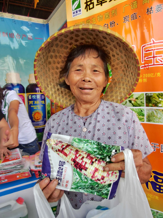 这位来自永发镇的83岁的曾阿婆是这个冬交会最大的“粉丝”,她说自己种了3亩地,每年都要淘新品种。这不,今年她淘到了彩色玉米新品种。本报记者操戈摄