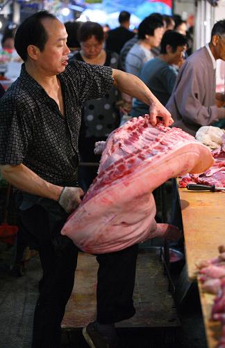 9月9日,猪肉销售商在江苏省南京市一家农贸市场内搬运猪肉。新华社发(王新 摄)