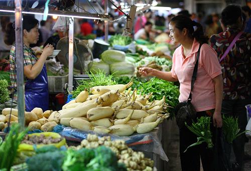 9月9日,市民在江苏省南京市一家农贸市场内选购蔬菜。国家统计局9日发布报告,8月份我国CPI同比上涨6.2%,其中食品类价格同比上涨13.4%,猪肉价格上涨45.5%,蛋价格上涨16.3%。新华社发(王新摄)