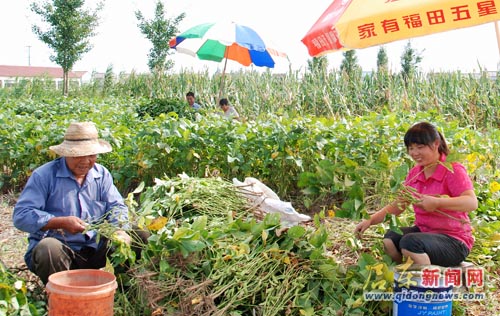 9月9日,惠萍镇海洪村18组村民茅飞平(左)在田头采摘青毛豆。眼下正是青毛豆大量上市季节,据了解,今年青毛豆收购价上升至每市斤1.4元,启东市20多万亩青毛豆喜获丰收,农民采摘出售青毛豆积极性甚高。