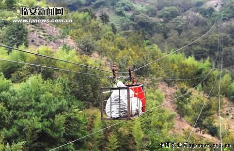 现场,记者对索道运送山核桃时间作了测试:铁笼箱每趟可装三四袋山核桃、250斤左右,一个来回只要6分钟左右时间。陪同我们的大学生村官金龙飞又指着不远处的一条沿山而下的白色管道告诉记者,用管道把山核桃运下山是一个谢姓村民想出的法子,那是一个大口径的不锈钢管道,管道的上口呈漏斗状,将采收下来的山核桃往这个“漏斗”上一倒,就能哗哗地滚到山脚,然后再装车运走,免去了肩挑之苦,也节省了时间。