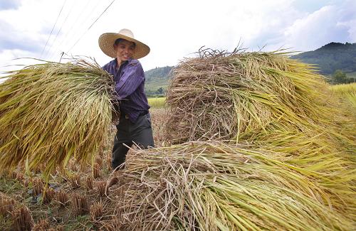 近日,江西省崇义县上堡乡高山梯田进入秋收时节。由于新优水稻品种在当地推广面积加大,并且未出现严重自然灾害 ,今年上堡高山梯田水稻产量好与往年。上堡乡耕地面积1.2万亩,其中海拔500米以上的耕地约1万亩,占总面积90%,最高海拔865米。耕地栽种主要农作物是一季中稻。新华社发(万象摄)