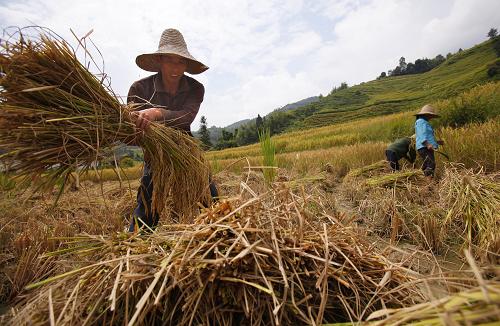 9月15日,江西省崇义县上堡乡的农民在收割稻谷。