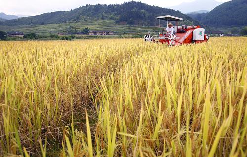 9月15日,江西省崇义县上堡乡农民驾驶收割机在田间收割稻谷。