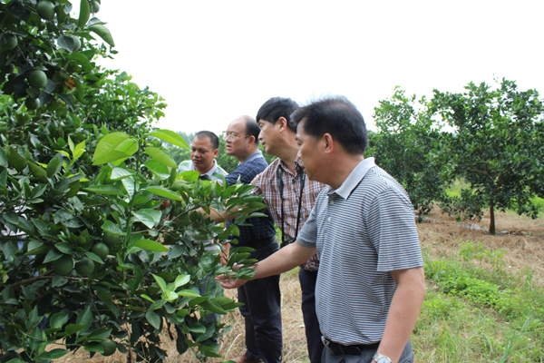 李标站长(左二)一行在合浦县乌家镇万亩柑桔生产基地实地考察