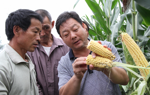 近日,山东省沂南县农业局农技站站长、高级农艺师王建进在苏村镇司马村,与当地农民交流玉米“一增四改”技术。