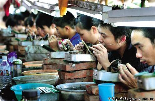 日前,在浙江嘉兴平湖市新仓镇杉青港村农户孙泉奎家,二三十名珍珠育种工正忙着在河蚌内种植珍珠。今年,老孙家养殖珍珠河蚌约20万个,预计5年后可收获珍珠。 老嘉兴人都曾记得,上世纪80年代,珠蚌养殖是嘉兴的特色产业,后因水质下降和价格因素几乎消失。近年来,随着河水水质好转及价格看好,嘉兴民间又开始养殖珠蚌了。中国水产养殖网记者了解到,浙江嘉兴历来是珍珠养殖的重要区域,嘉兴的珍珠在我国的珍珠界名气颇大,最近几年随着水质的变坏,不少珍珠养殖水面被清理了,导致嘉兴的珍珠产业规模减少,珍珠价格也比以前有所回升。