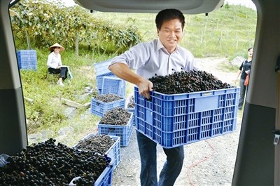 9月20日,记者在该县四把镇水源林毛葡萄基地看到,果农正在采摘毛葡萄,不少城区居民到基地购买毛葡萄,自己酿葡萄酒。据了解,去年毛葡萄的售价每公斤为3.6元,而记者现场看到果农每公斤售价4.6元,比去年上涨20%。图为果农在销售刚采摘下的新鲜毛葡萄。