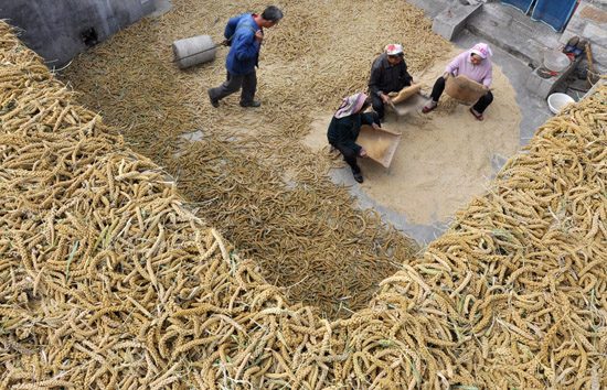 9月19日,山东省沂源县南鲁山镇陈家山村的农民在院子里晾晒收获的谷子。