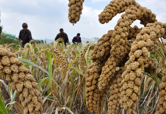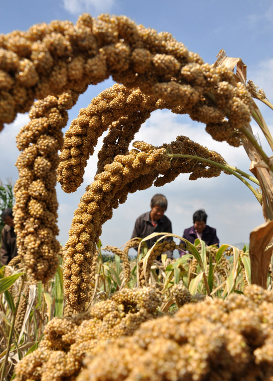 9月19日,山东省沂源县南鲁山镇陈家山村的农民在采收成熟的谷子。(新华社)