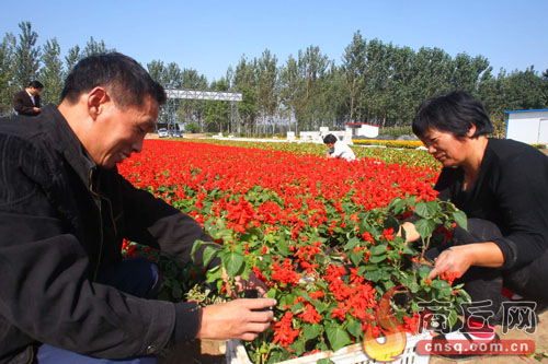 民权县伯党乡袁柿园村村民丁玲玲把培育好的串红花卉装箱。今年以来,该乡党委政府积极引导农民大力发展特色农业,丁玲玲率先返租20多亩耕地干起了大棚草本花卉的生意,眼下正值国庆前夕,孔雀草、百合等异常畅销,前来购花的外地车辆络绎不绝。