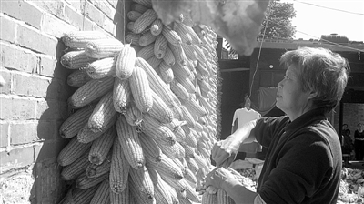 林州市原康镇大安村的老人郭改珍将收获的玉米棒子进行分拣,在墙上挂起了玉米辫。趁天气晴好,原康镇农民抓紧时间抢收山区岗地上的早熟玉米。 刘剑昆 摄