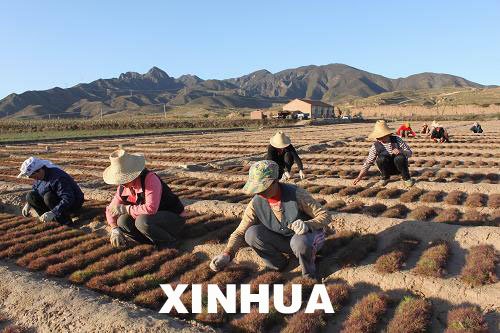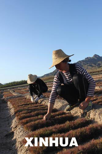 河北省赤城县雕鹗镇下虎村村民为油松苗除草(9月19日摄)。