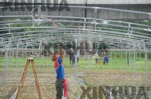 9月26日,琼海市的菜农正在赶搭菜圃遮雨大棚。