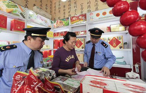 9月27日,北京东城工商分局工作人员在一家商店内核查北京特产果脯的进货渠道。
