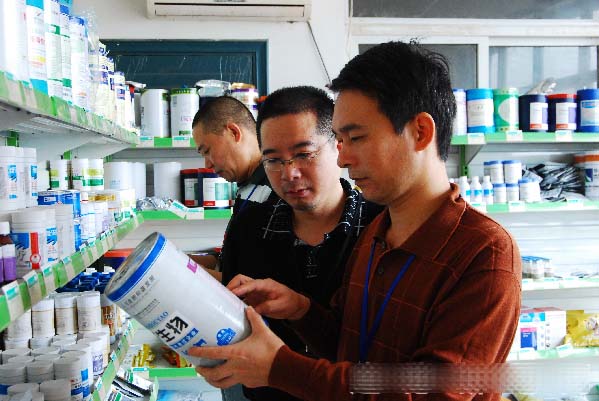 农业执法人员正在大同一兽药经营店内执法检查药品