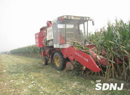 黄色的玉米地里,联合收割机正“突突突”地来回穿梭,机器前的四个“大叉子”插入三行玉米间,被割断的玉米秸秆顺势进入收割机,随着机器的转动,玉米棒被“掰”下来,随升运器送到后面的粮斗,玉米秸秆则同时被粉碎机化为碎末撒在地上,阵阵清香扑鼻而来。观望的农民不时发出赞叹声:“这机器真棒,省老力了!”、“看来以后再也不用出力掰玉米啦” 、“听说老董买这台收割机国家给补贴了4.3万”、“我也准备申请补贴买台。”