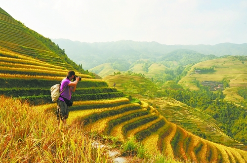 近日,一位摄影爱好者在龙脊梯田拍照。近年来,龙胜龙脊梯田景区科学种植水稻,把水稻成熟期控制在国庆长假前后,这时的梯田到处都是飘香的金黄稻穗,一派丰收的景象令中外游客云集。
