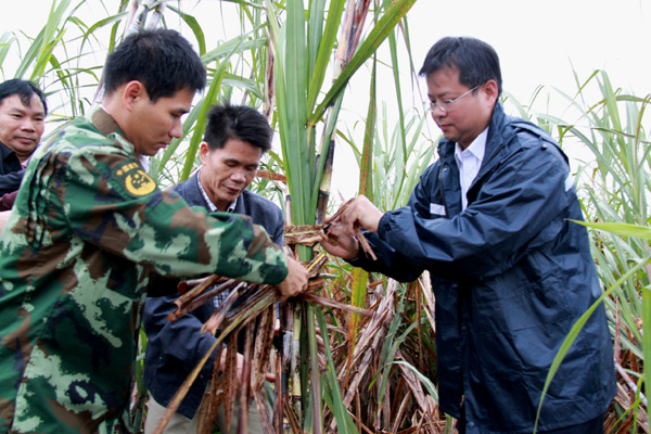 钦南区区委书记林海波(右一)与农业局局长符国钦(右二)帮助群众护理甘蔗