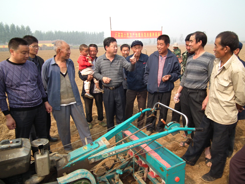 10月8日,在山东省沂南县苏村镇司马村的田间地头,该县农业技术人员正在指导农民如何拌种、施肥、播种小麦。