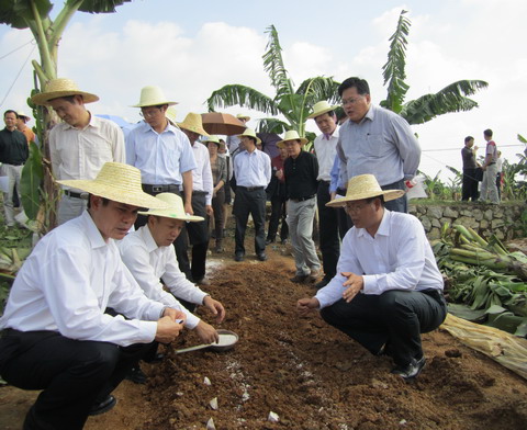 参加会议的代表观摩灾后蕉园套种马铃薯等冬种作物。左二蒋连生(市委副书记),左一雷海良(副市长),左第二排一卢阳春(副主席),右第二排一赵龙(农业局长局长)