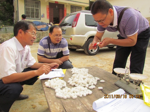 2011年9月18日,广西蚕业技术推广总站白景彰研究员等专家到那坡县指导桑蚕生产工作。专家一行先后到那坡县重点蚕区进行《小蚕共育技术创新与推广应用》项目验收,深入那坡县桑树优良品种展示园田间地头实地考察,并对那坡县的桑蚕生产工作提出指导性意见。