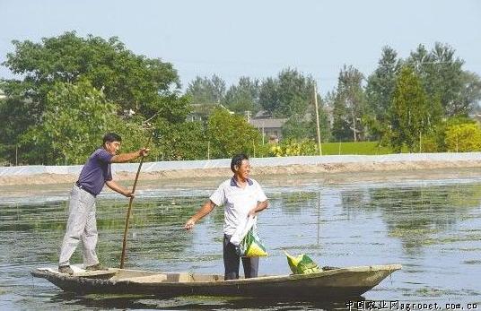 图为该镇民权村鳌蟹养殖基地农民正在给蟹喂食。