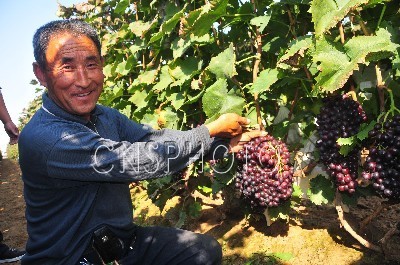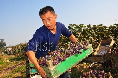 10月7日,山东龙口市兰高镇沙村果农收获巨峰葡萄。一直占居山东省烟台市红富士系列品种首位的龙口市,今年12万亩苹果、葡萄等水果又迎来一个丰收年,预计总产可达37.5万吨。
