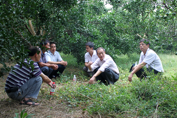近日,广西柑桔研究所所长陈国平带领科研人员到恭城指导水果生产。陈所长先后到龙虎乡、嘉会乡、平安乡详细了解恭城水果的生产情况,全面分析当前存在的问题,指导农民抓好当前生产。陈所长特别指出,恭城应在继续抓好柑桔黄龙病的综合防控工作的同时,充分利用沙田柚对柑桔黄龙病抗性好、传统优势明显的特点,利用地理和气候条件进一步抓好恭城沙田柚的发展。要通过建立示范区,带动周边农民加快沙田柚的标准化生产,进一步促进产业结构调整快速发展。