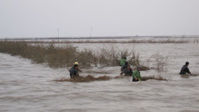 10月5日凌晨,江苏南通市通州区渔业科技入户指导员蒋建斌与示范户龚卫星、俞建杨及10余位养殖工人乘船前往花蛤预备养殖场地插竹子。