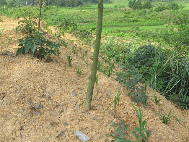 针对环江县坡地水土流失严重和季节性干旱缺水,导致土壤耕层浅薄、土地贫瘠、作物产量低的状况,在项目实施中,采用工程措施与农艺措施相结合,探索应用“生物篱+等高种植+生物覆盖+测土配方施肥”的节水农业技术模式,固土保水,增加土壤蓄水量,减少水分蒸发,达到留住天上降水,增强土壤蓄水抗旱能力,提高水肥资源利用效率,促进农业可持续发展。