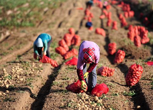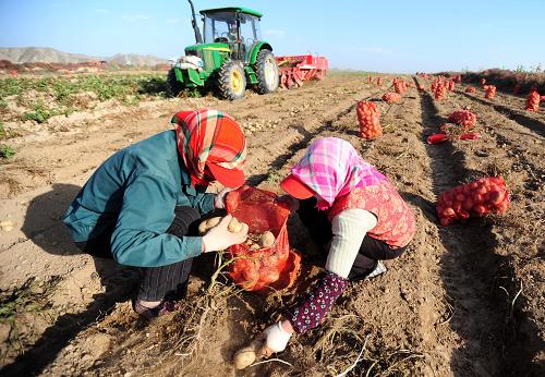 农民在甘肃省靖远县乌兰镇北大坪马铃薯制种基地收获马铃薯种子(10月14日摄)。