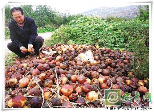 记者开车从蚌埠市西出口向西行驶,来到位于涂山风景区下洪村石榴园内看到,一个个石榴压弯了树枝。据下洪村石榴协会会长陈玉林介绍,眼看石榴销售的高峰期都已经过了,可是这么多的石榴依然无人问津。记者在陈玉林的带领下来到果园查看,发现不少石榴烂在园内,树上有许多石榴已开裂。村民石贵荣说:“今天摘了3000斤,有1000斤都开裂了。”陈玉林告诉记者,今年怀远石榴获得了大丰收,涂山风景区目前是怀远最大的石榴产区,总产量能占到90%左右,仅下洪村大约就有100万公斤以上,大部分还在枝头挂着(如图),其中多数为老品种――― 青皮石榴。“现在下洪村的石榴只卖出去十分之一,可是销售旺季已经过去了。”陈玉林说,每年的中秋节是石榴销售的旺季,往年早就卖得差不多了,今年却卖不动。陈玉林家的石榴预计今年产量在10000多公斤,但如今他只卖出去1000多公斤。据他所知,在下洪村,比他滞销得严重的还有不少人家。