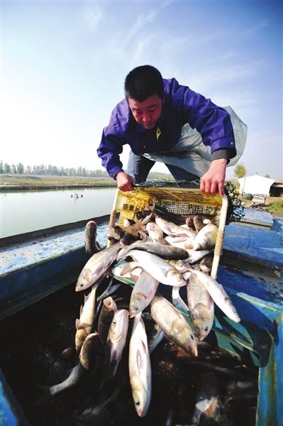 鱼池里,鱼儿在渔网中“噼噼啪啪”跳个不停。“一网不可能全都捞完,得一边抽水,一边撒网,等到鱼池里快没水的时候,再用网去打捞。不管用什么方法,漏网之鱼还是会有的。”捕鱼队负责人周宗林告诉笔者。他介绍,池塘里有鲢鱼、鲫鱼、鲤鱼、草鱼,鲢鱼一般都在池水上部,而鲤鱼、草鱼则在池底。