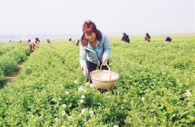 人民网河南频道讯 10月19日,汤阴县伏道镇岗阳村村民在采摘杭白菊。近日,汤阴县6000余亩菊花喜获丰收,当地菊农开始大面积采摘菊花。汤阴县近年大力发展医药产业,鼓励农民种植菊花、金银花等中药材,目前已经形成集种苗栽培管理、收购、加工、销售于一体的产业链,产品远销广州、武汉等食品、药品市场及海外地区.