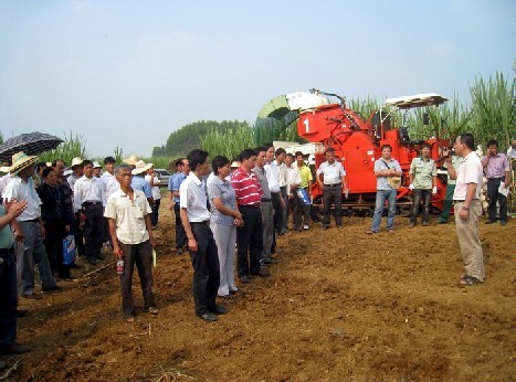 演示培训现场会分为两部分:9时至11时在灵运酒店多功能厅会议室由南宁市农业技术推广站站长、推广研究员邝伟生主讲机械化对甘蔗农艺性状影响进行研究分析。14时至16时在武帽东江糖厂甘蔗基地进行实地现场演示,钦州力顺公司进行甘蔗种植机械化演示。该机型为双行2CZX-2型甘蔗种植机,结构紧凑、轻巧,整机重量轻,配套范围广,可与70匹马力以上各种轮式拖拉机配套进行甘蔗种植作业,适应大部分现有拖拉机用户需要,可实现800-130mm无级调整;行距调整简单、轻便、快捷,熟练操作可在十分钟时间内把行距调整到位;更适应坡地及丘陵地带的蔗地种植作业;同时一次性完成开沟、施肥、切种、播种、喷药、培土、覆膜、镇压等甘蔗种植作业,一小时可种植3亩甘蔗地。随后广州科利亚公司进行了甘蔗机械化收获技术演示。