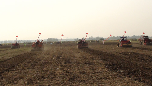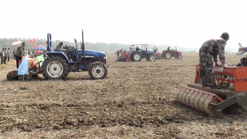 比赛现场,彩旗招展、机器轰鸣,参加比赛的机械来回穿梭,激烈角逐,充分展示了机条播技术工作效率高、用种量少、保墒、播种均匀、便于田间管理的巨大优势,让现场观看的近千名群众赞不绝口。